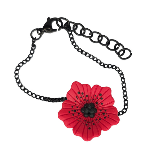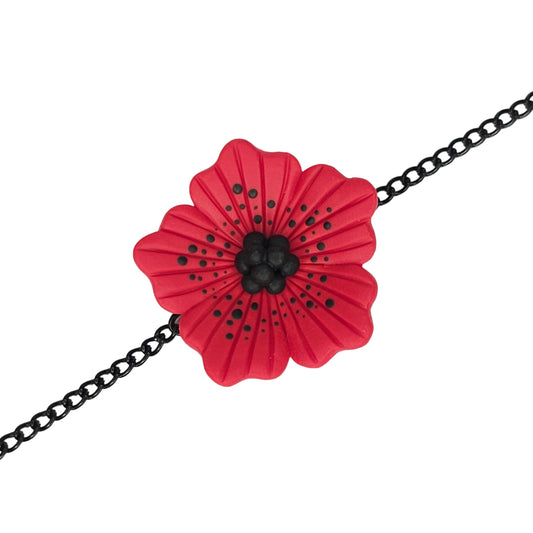 Βραχιόλι λουλούδι κόκκινο από πολυμερικό πηλό με μαύρη ατσάλινη αλυσίδα