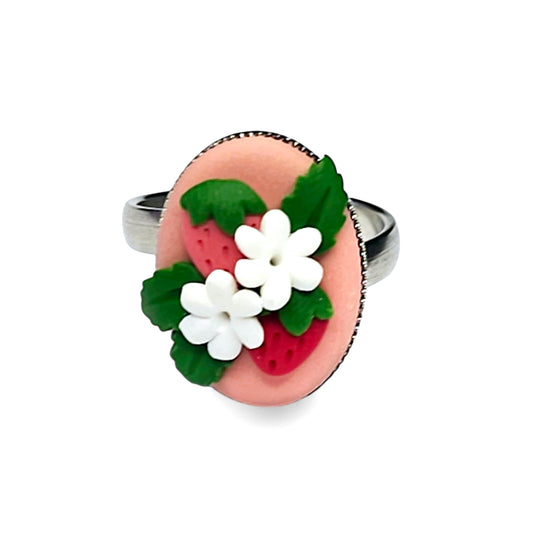 Οβάλ ατσάλινο δαχτυλίδι με κόκκινες φραουλίτσες σε απαλό ροζ φόντο από πολυμερικό πηλό