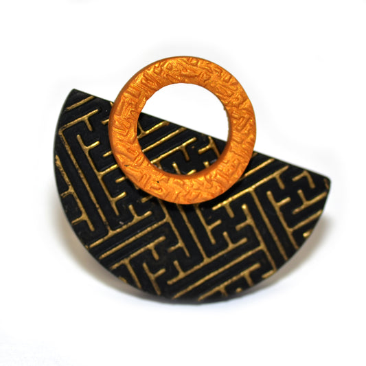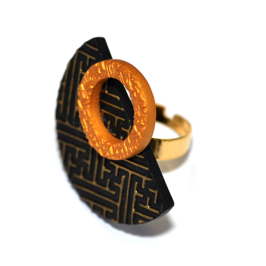 Μεγάλο δαχτυλίδι ημικύκλιο μαύρο με χρυσό μαίανδρο από πολυμερικό πηλό