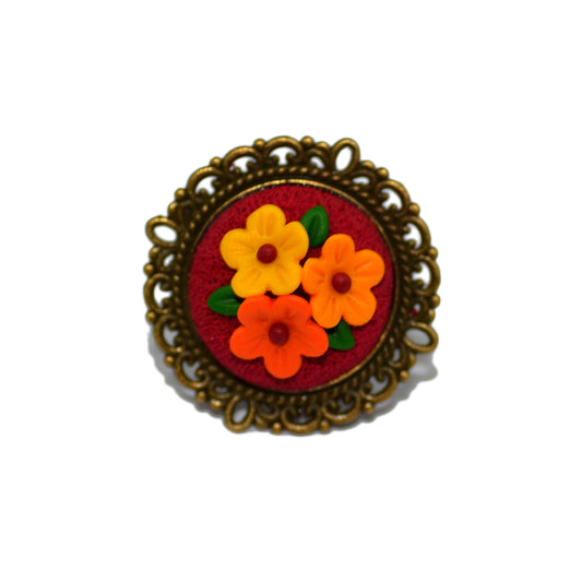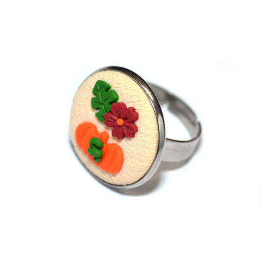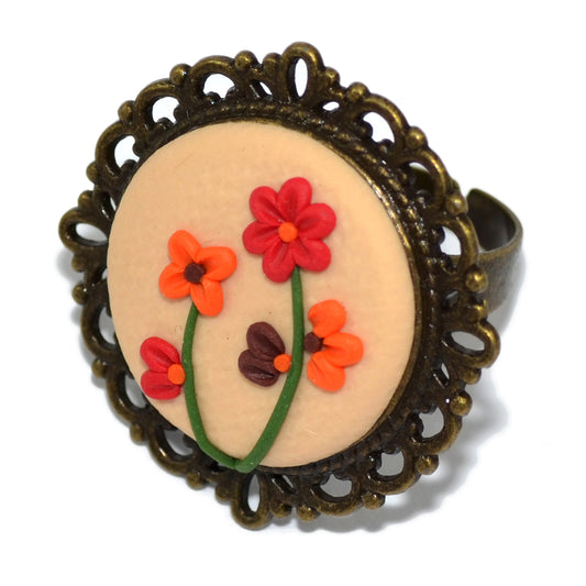 Στρογγυλό βίνταζ δαχτυλίδι με λουλουδάκια σε φθινοπωρινές αποχρώσεις από πολυμερικό πηλό