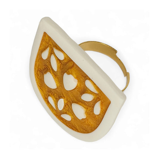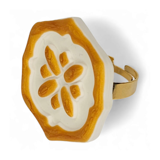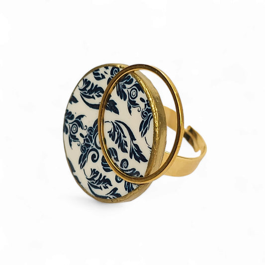 Χειροποίητο δαχτυλίδι πλακάκι από πολυμερικό πηλό σε λευκό με χρυσό και ρυθμιζόμενη επιχρυσωμένη ατσάλινη βάση