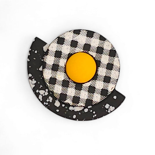 Πρωτότυπο γεωμετρικό δαχτυλίδι ασπρόμαυρο ημικύκλιο, στρογγυλό καρό και λίγο κίτρινο από πολυμερικό πηλό