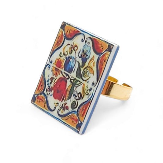 Τετράγωνο δαχτυλίδι με μοτίβο πολύχρωμα πλακάκια από πολυμερικό πηλό κι επιχρυσωμένη ατσάλινη βάση