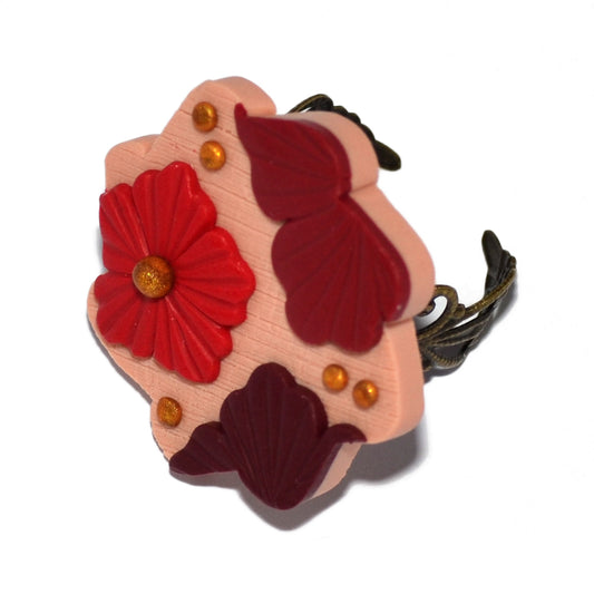Δαχτυλίδι με ιδιαίτερο κόψιμο και ανάγλυφα λουλούδια από πολυμερικό πηλό σε μπορντό αποχρώσεις
