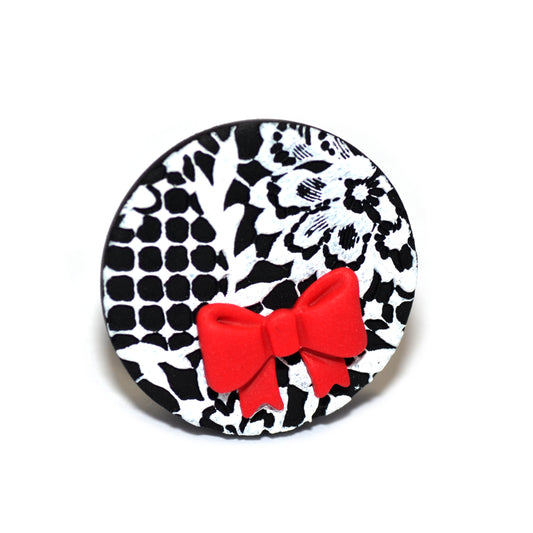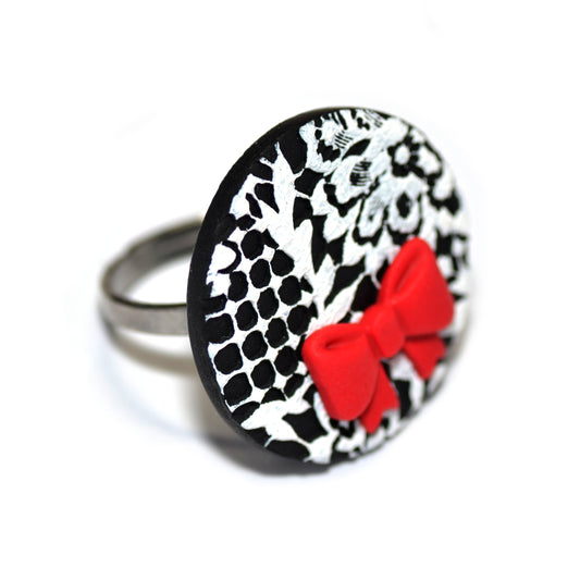 Στρογγυλό ρομαντικό δαχτυλίδι μαύρη δαντέλα με κόκκινο φιόγκο από πολυμερικό πηλό