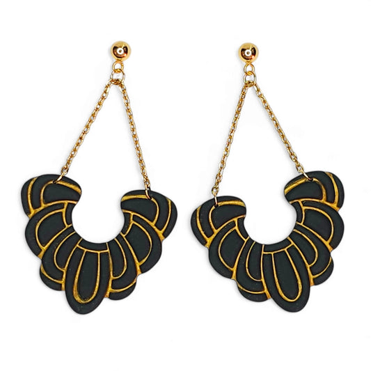 Κρεμαστά μαύρα σκουλαρίκια με χρυσές λεπτομέρειες από πολυμερικό πηλό και λεπτή επιχρυσωμένη ατσάλινη αλυσίδα