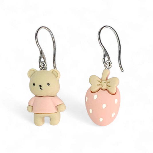 Ανόμοια κρεμαστά σκουλαρίκια αρκουδάκι με ροζ μπλουζάκι και ροζ φραουλίτσα
