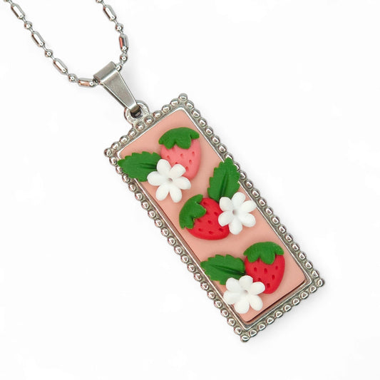 Μακρύ ατσάλινο κολιέ με κόκκινες φραουλίτσες σε απαλό ροζ φόντο από πολυμερικό πηλό