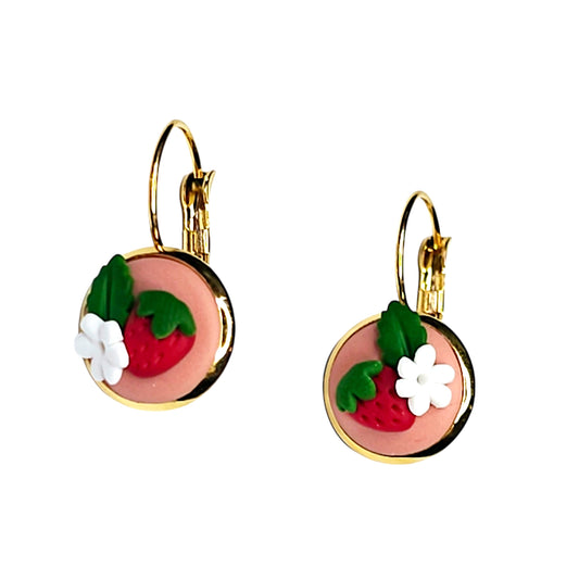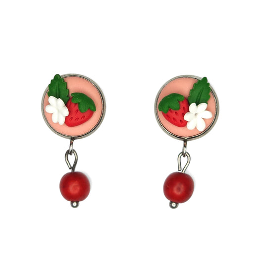 Μικρά κρεμαστά στρογγυλά σκουλαρίκια κόκκινες φραουλίτσες σε απαλό ροζ φόντο από πολυμερικό πηλό με πέτρες χαολίτη