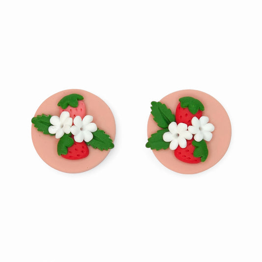 Καρφωτά σκουλαρίκια στρογγυλά κόκκινες φραουλίτσες σε απαλό ροζ φόντο από πολυμερικό πηλό