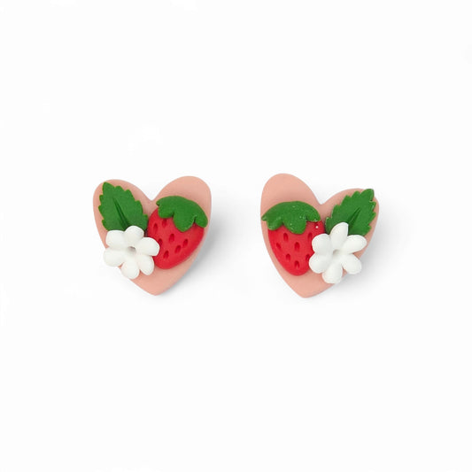 Καρφωτά σκουλαρίκια καρδούλες κόκκινες φραουλίτσες σε απαλό ροζ φόντο από πολυμερικό πηλό