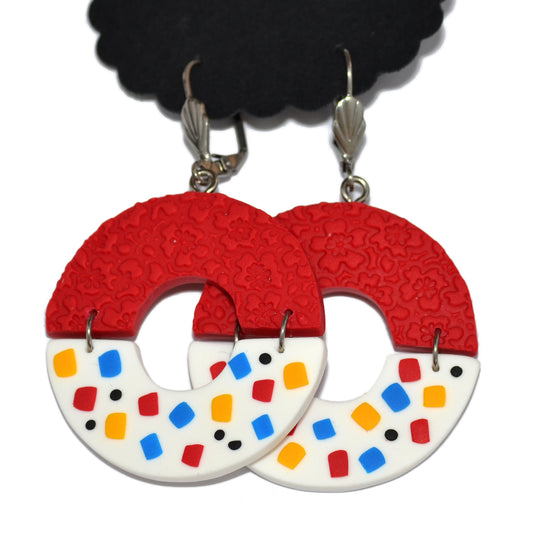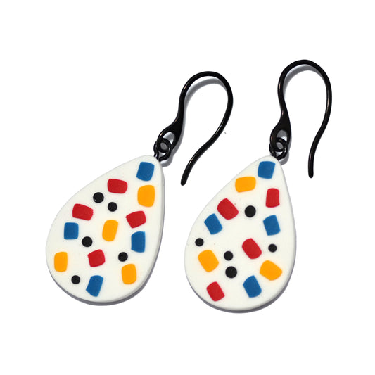 Κρεμαστά άσπρα σκουλαρίκια δάκρυα με κόκκινες κίτρινες μπλε μαύρες πιτσιλιές και μαύρα ατσάλινα γαντζάκια