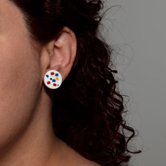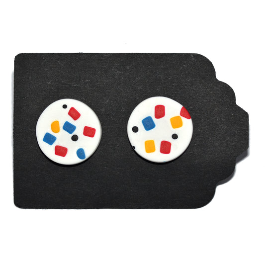 Στρόγγυλα καρφωτά σκουλαρίκια λευκά πιτσιλωτά με κόκκινο κίτρινο και μπλε