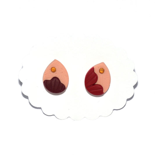 Καρφωτά σκουλαρίκια σταγόνες με ανάγλυφα λουλούδια από πολυμερικό πηλό σε μπορντό αποχρώσεις