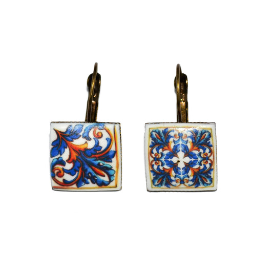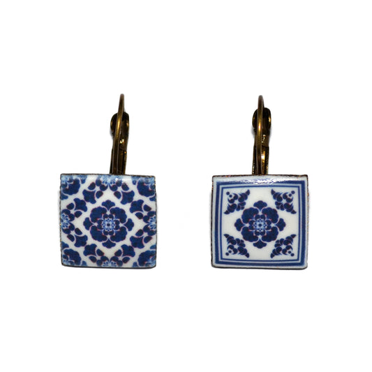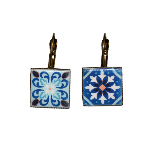 Λίγο κρεμαστά ανόμοια σκουλαρίκια τετράγωνα πλακάκια μπλε σε μπρονζέ βάσεις