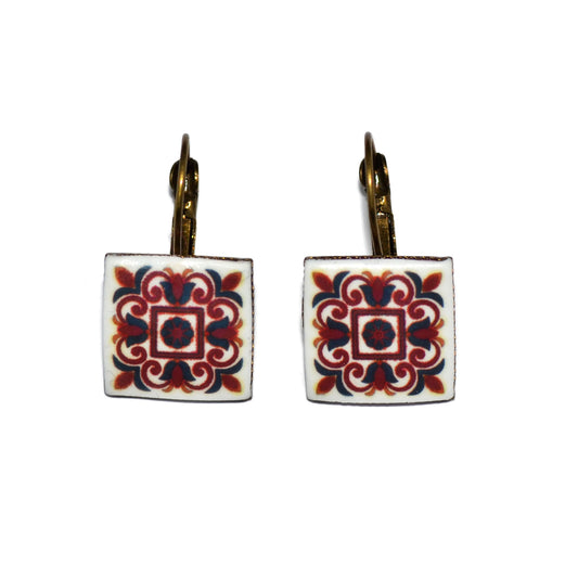 Λίγο κρεμαστά σκουλαρίκια τετράγωνα πλακάκια κόκκινο με λευκό φόντο σε μπρονζέ βάσεις