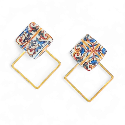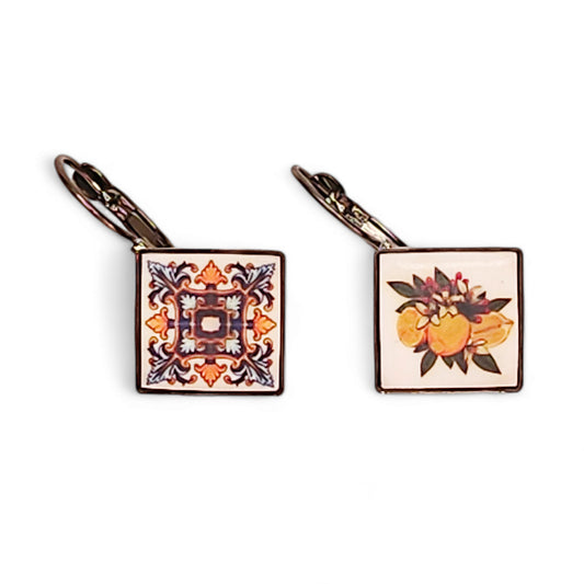 Μικρά κρεμαστά σκουλαρίκια τετραγωνάκια με τεχνική μεταφοράς εικόνας σε πολυμερικό πηλό και ατσάλινες βάσεις