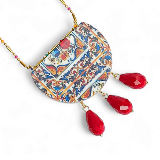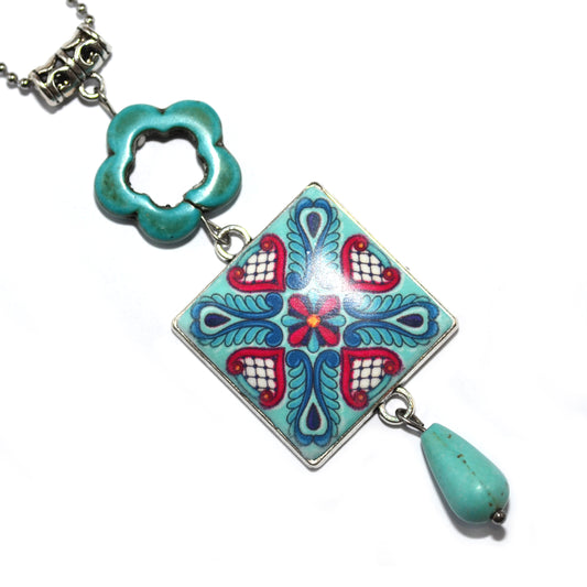 Μακρύ κολιέ τετράγωνο τυρκουάζ πλακάκι λαϊκής τέχνης με πέτρες χαολίτη