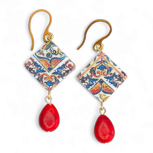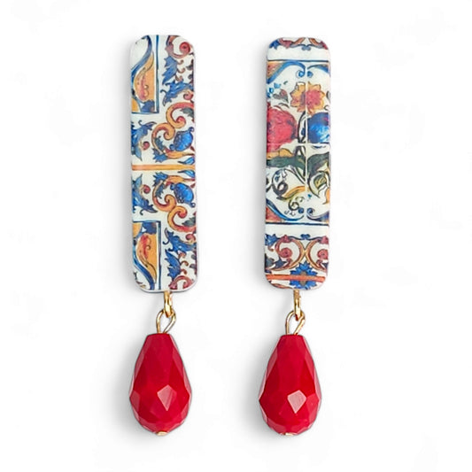 Κρεμαστά σκουλαρίκια ρόμβοι με μοτίβο πολύχρωμα πλακάκια από πολυμερικό πηλό και κόκκινες πέτρες αχάτη