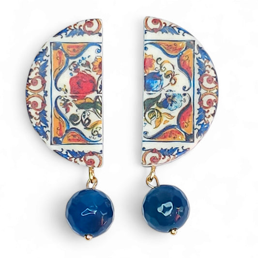Καρφωτά σκουλαρίκια ημικύκλια με μοτίβο πολύχρωμα πλακάκια από πολυμερικό πηλό και μπλε πέτρες αχάτη
