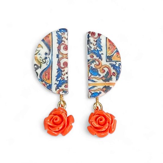 Καρφωτά σκουλαρίκια ημικύκλια με μοτίβο πολύχρωμα πλακάκια από πολυμερικό πηλό και κρεμαστά πορτοκαλί τριανταφυλλάκια