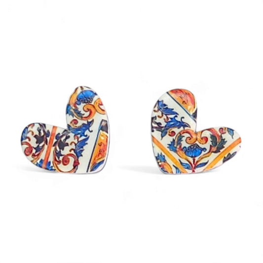 Καρφωτά σκουλαρίκια καρδιές με μοτίβο πολύχρωμα πλακάκια από πολυμερικό πηλό