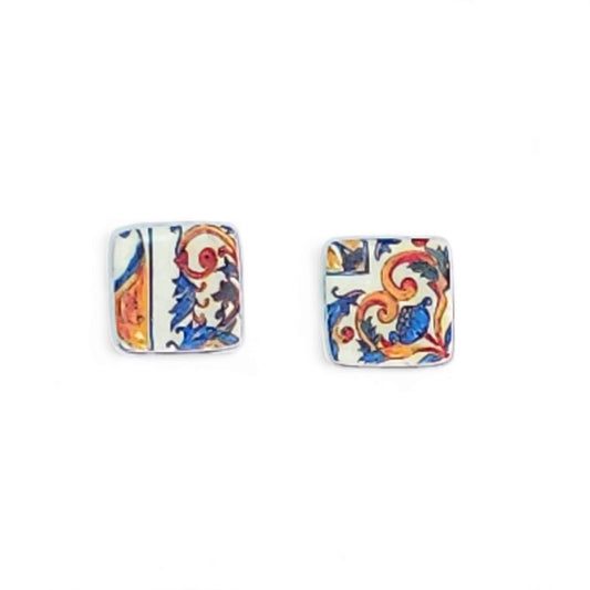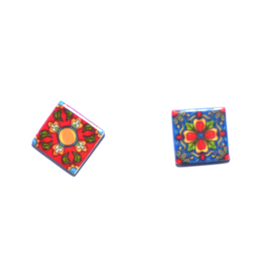 Καρφωτά σκουλαρίκια μικρά τετραγωνάκια με τεχνική μεταφοράς εικόνας σε πολυμερικό πηλό