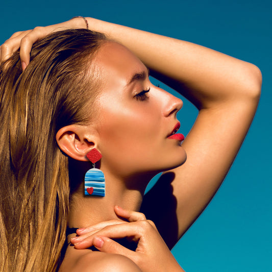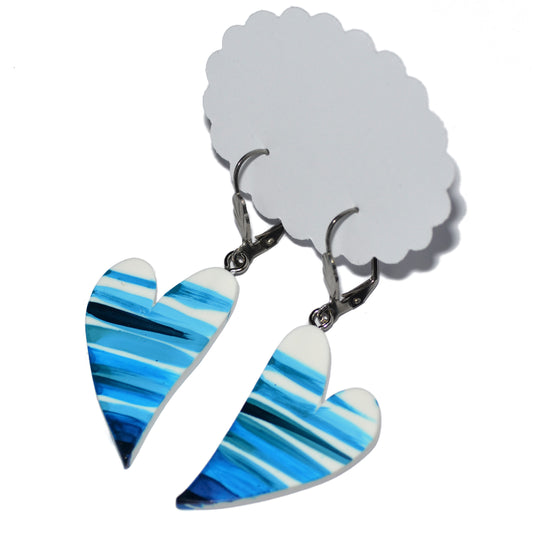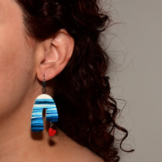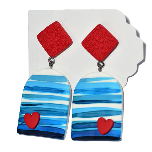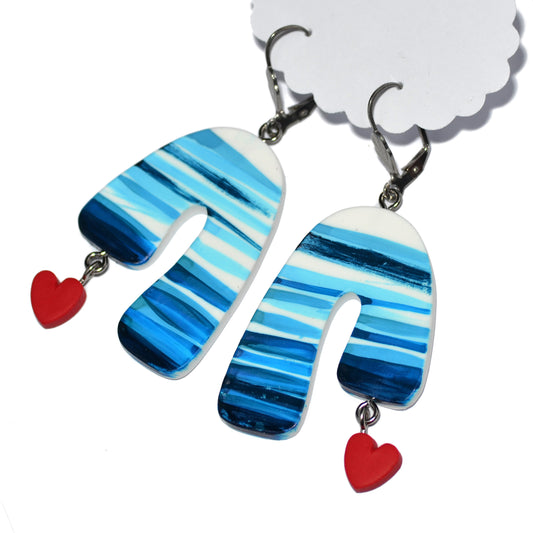 Κρεμαστά σκουλαρίκια ριγέ τυρκουάζ με κόκκινες καρδιές απ'τη συλλογή For the love of summer ζωγραφισμένα στο χέρι