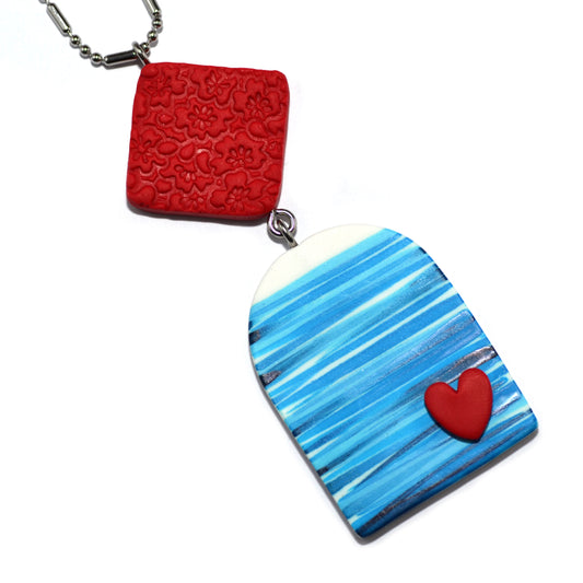 Μακρύ κολιέ ριγέ τυρκουάζ αψίδα με κόκκινο τετραγωνάκι από πολυμερικό πηλό