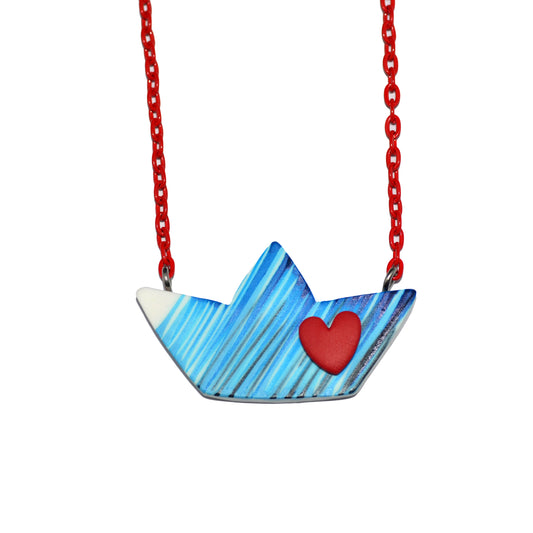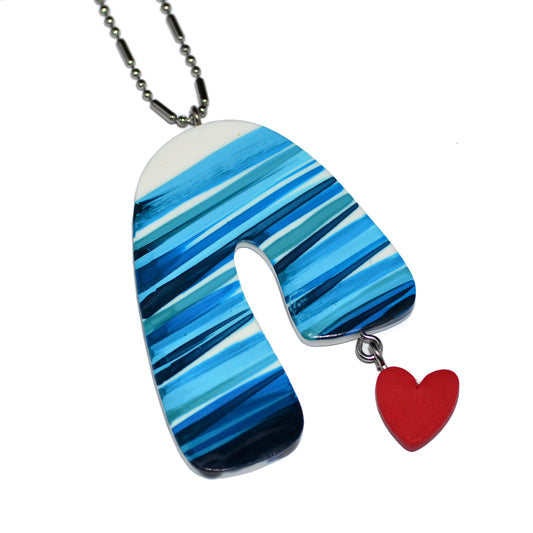 Μακρύ κολιέ με ιδιαίτερο κόψιμο ριγέ τυρκουάζ με κρεμαστή κόκκινη καρδιά και ατσάλινη αλυσίδα