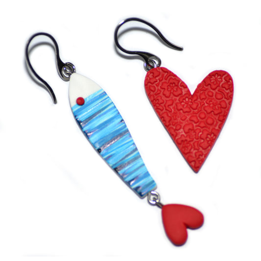 Σκουλαρίκια ανόμοια ψαράκι με ουρίτσα καρδούλα και κόκκινη καρδιά από πολυμερικό πηλό