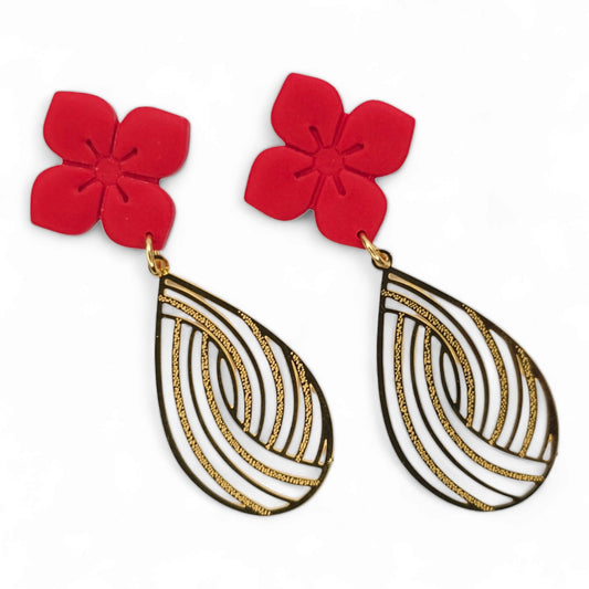 Σκουλαρίκια κρεμαστά κόκκινα λουλούδια με χρυσά ατσάλινα φιλιγκράν