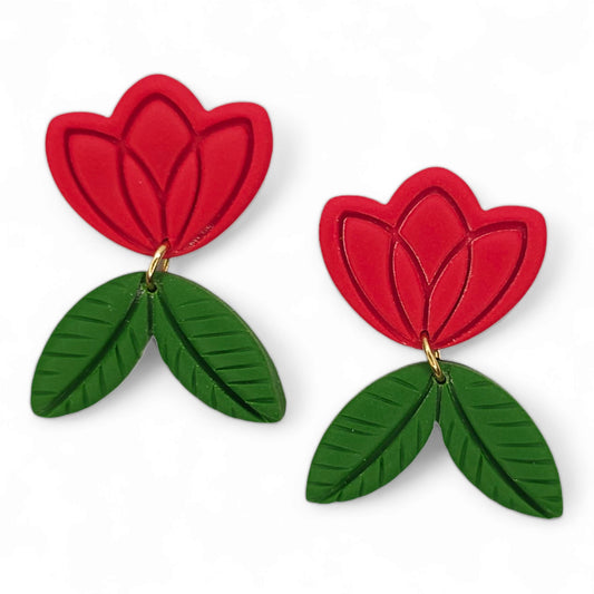 Σκουλαρίκια κρεμαστά κόκκινες τουλίπες με πράσινα φύλλα από πολυμερικό πηλό