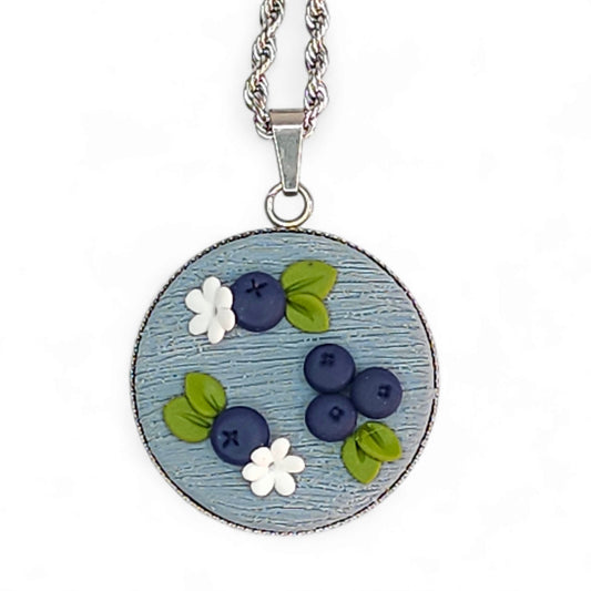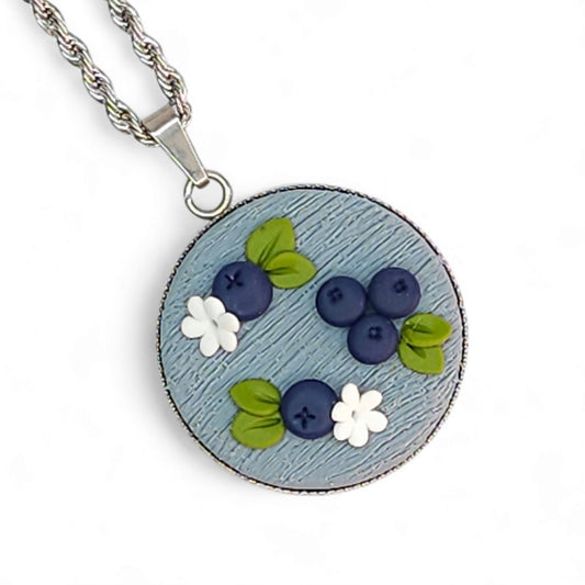 Μικρό κολιέ locket ατσάλινη καρδιά με μπλε μύρτιλα λευκά λουλουδάκια και πράσινα φυλλαράκια από πολυμερικό πηλό σε ατσάλινη βάση με ατσάλινη αλυσίδα