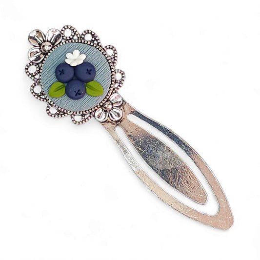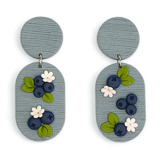 Κρεμαστά μπλε-γκρι σκουλαρίκια με μπλε μύρτιλα λευκά λουλουδάκια και πράσινα φυλλαράκια από πολυμερικό πηλό και ατσάλινα κρεμαστά στοιχεία