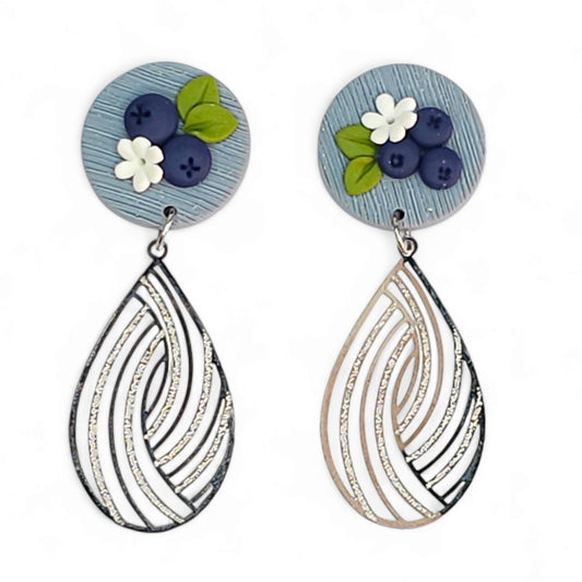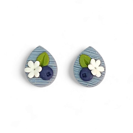 Καρφωτά μπλε-γκρι σκουλαρίκια δάκρυα με μπλε μύρτιλα λευκά λουλουδάκια και πράσινα φυλλαράκια από πολυμερικό πηλό