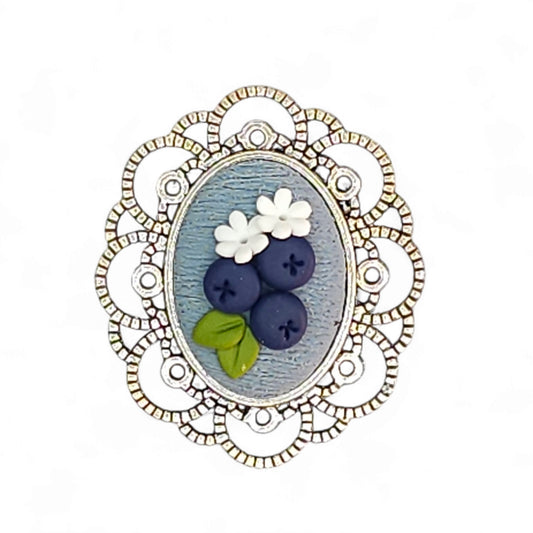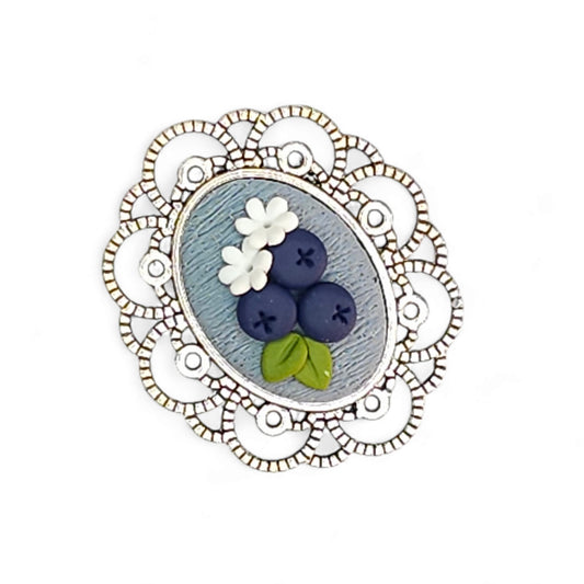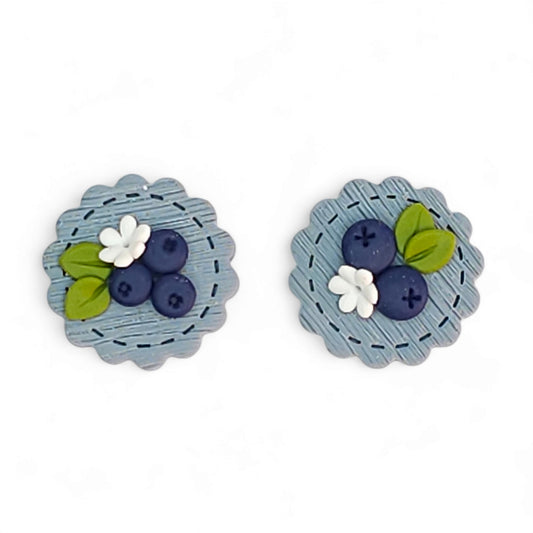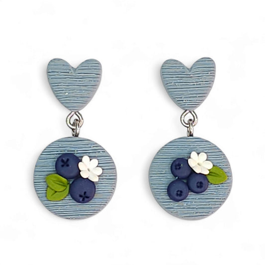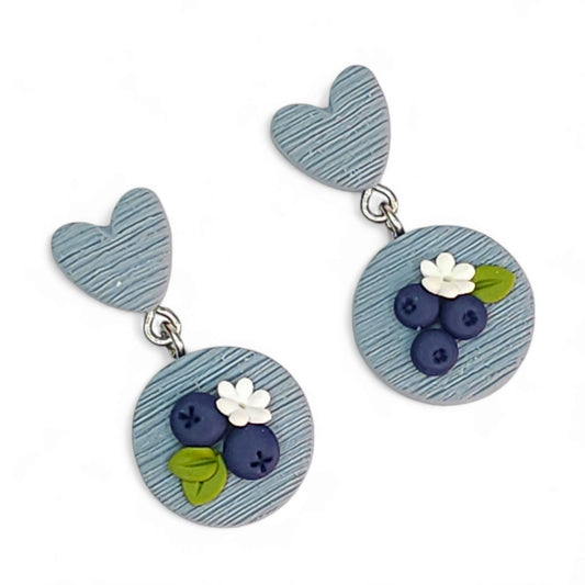 Καρφωτά ρομαντικά στρογγυλά μπλε-γκρι σκουλαρίκια με μπλε μύρτιλα λευκά λουλουδάκια και πράσινα φυλλαράκια από πολυμερικό πηλό