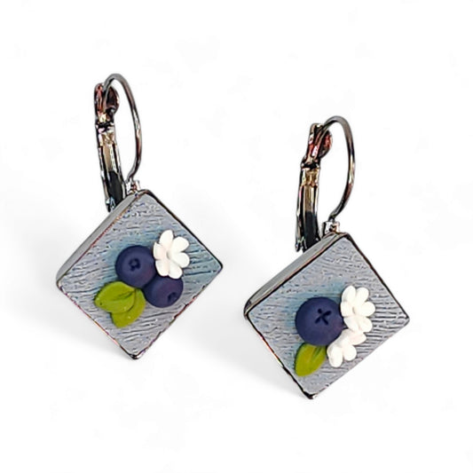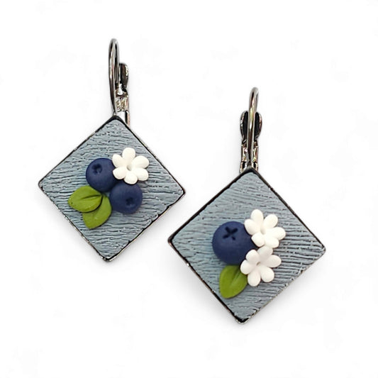 Κρεμαστά τετράγωνα μικρά μπλε-γκρι σκουλαρίκια με μπλε μύρτιλα λευκά λουλουδάκια και πράσινα φυλλαράκια από πολυμερικό πηλό
