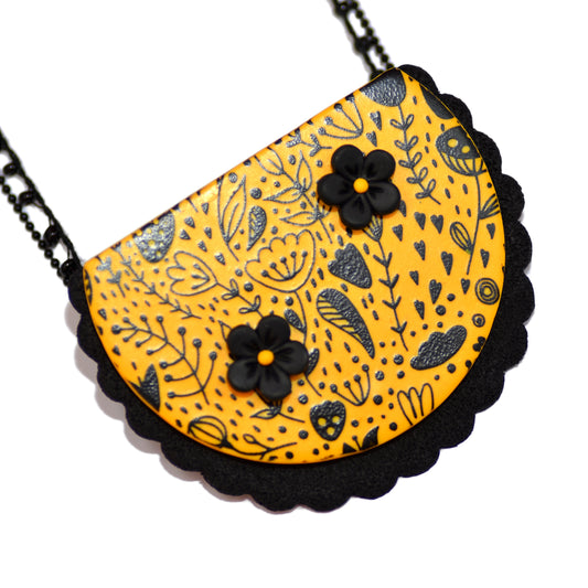 Μεγάλο εντυπωσιακό κολιέ κίτρινο με μαύρη μεταξοτυπία από πολυμερικό πηλό