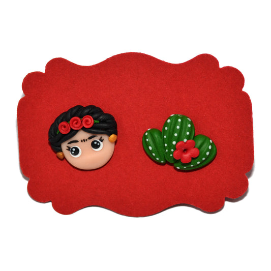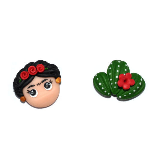 Ανόμοια καρφωτά σκουλαρίκια προσωπάκι Φρίντα με πράσινο κάκτο από πολυμερικό πηλό