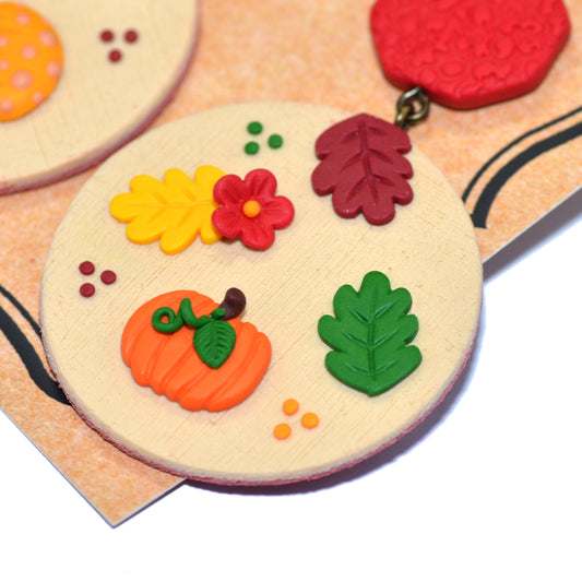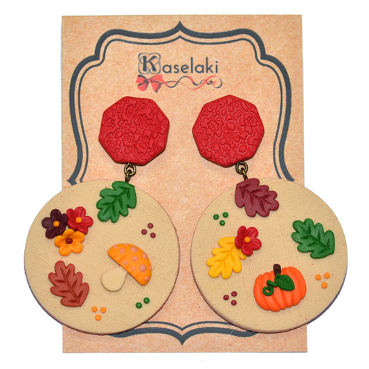 Κρεμαστά μεγάλα σκουλαρίκια με ανάγλυφα φθινοπωρινά στοιχεία από πολυμερικό πηλό