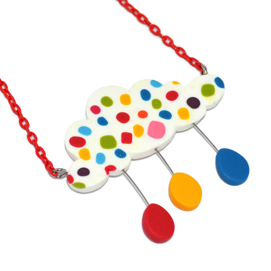 Κολιέ πολύχρωμο πιτσιλωτό σύννεφο με χρωματιστή βροχή και κόκκινη αλυσίδα