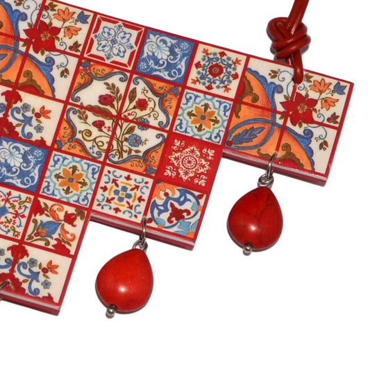 Μεγάλο εντυπωσιακό κολιέ με πλακάκια λαϊκής τέχνης σε κόκκινες αποχρώσεις με πέτρες χαολίτη
