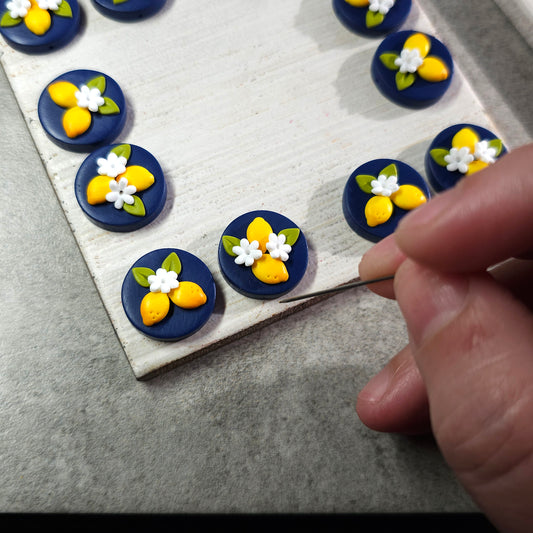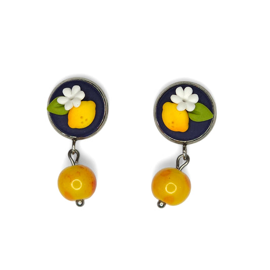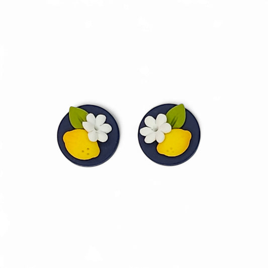 Καρφωτά σκουλαρίκια στρογγυλά κίτρινα λεμόνια σε μπλε φόντο από πολυμερικό πηλό