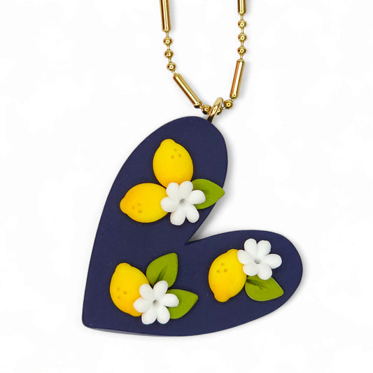 Μακρύ κολιέ καρδιά με κίτρινα λεμόνια σε μπλε φόντο από πολυμερικό πηλό