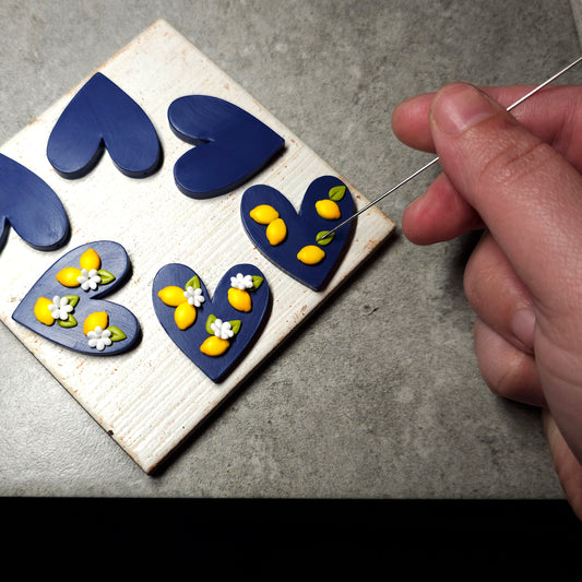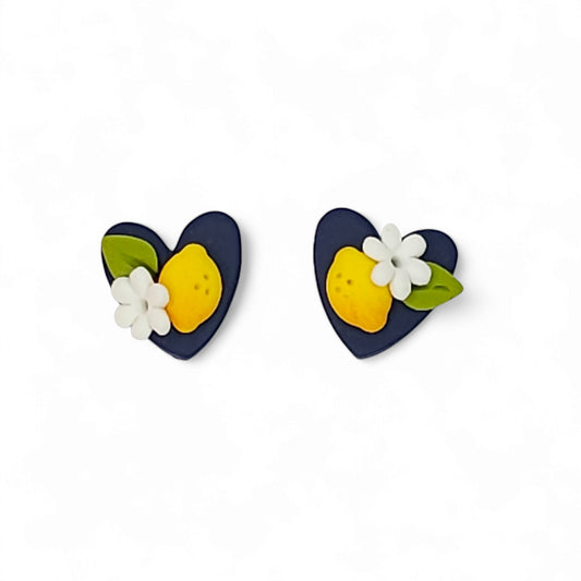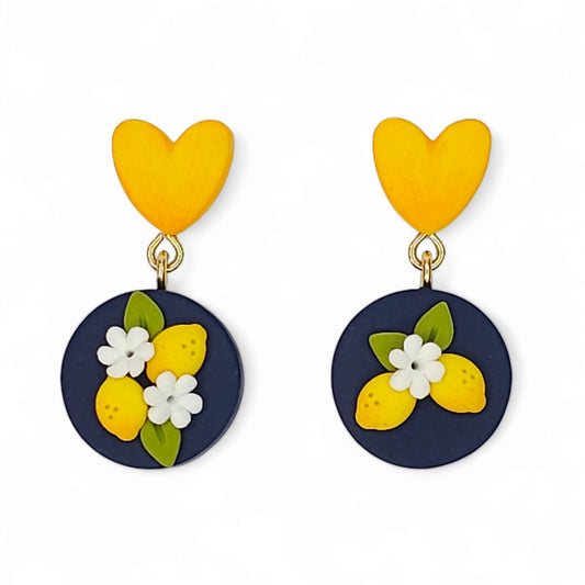 Καρφωτά σκουλαρίκια καρδιές κίτρινα λεμόνια σε μπλε φόντο από πολυμερικό πηλό