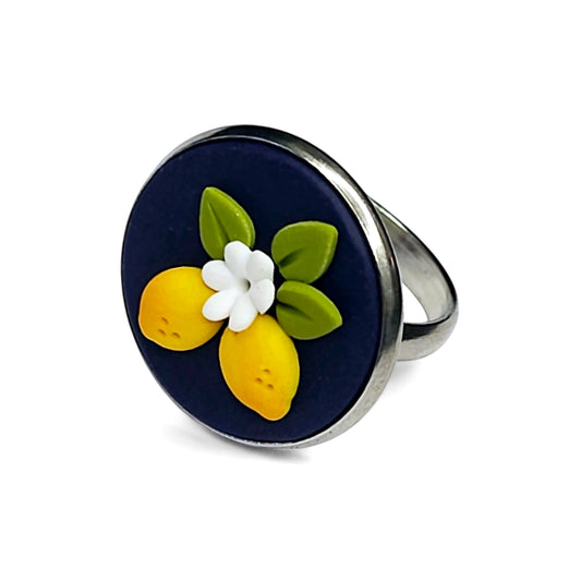 Στρογγυλό ατσάλινο δαχτυλίδι με κίτρινα λεμόνια σε μπλε φόντο από πολυμερικό πηλό