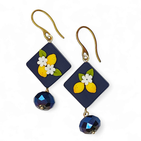 Σκουλαρίκια τετράγωνα κρεμαστά κίτρινα λεμόνια σε μπλε φόντο από πολυμερικό πηλό με μπλε κρύσταλλα