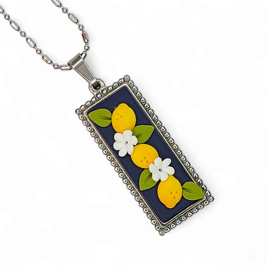 Μακρύ ατσάλινο κολιέ με κίτρινα λεμόνια σε μπλε φόντο από πολυμερικό πηλό