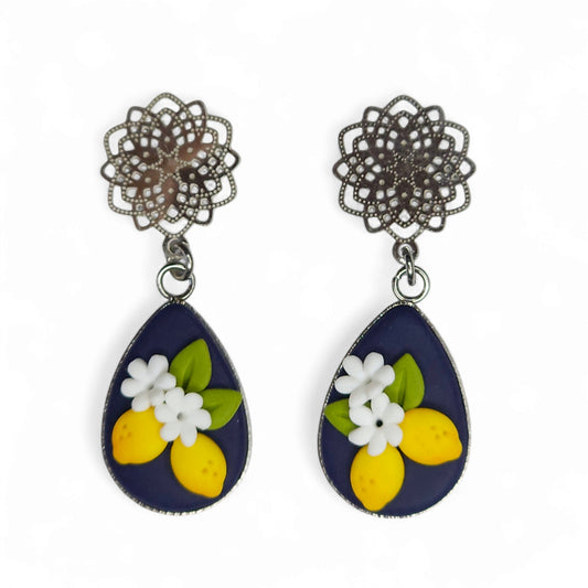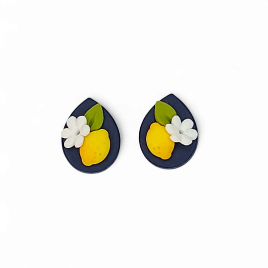 Καρφωτά σκουλαρίκια δάκρυα κίτρινα λεμόνια σε μπλε φόντο από πολυμερικό πηλό
